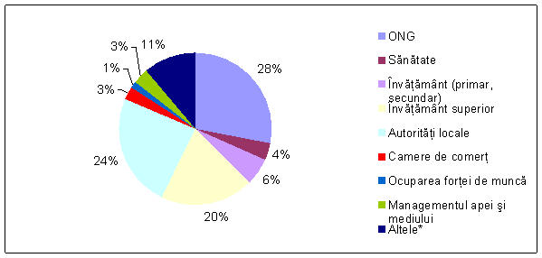 Reprezentarea grafică de mai jos arată interesul crescut al organizaţiilor neguvernamentale pentru prima solicitare de propuneri de proiecte, în timp ce în cadrul celei de-a doua solicitări de propuneri de proiecte, datorită eforturilor financiare mai mari pe care proiectele de infrastructură specifice acesteia le presupune, majoritatea aplicanţilor au provenit din sfera publică (instituţii de sănătate publică, autorităţi publice locale). S-a remarcat faptul că, instituţiile de învăţământ superior au fost active în cadrul ambelor solicitări de propuneri de proiecte, manifestând interes atât pentru proiecte soft cât şi pentru investiţii de mai mare amploare.